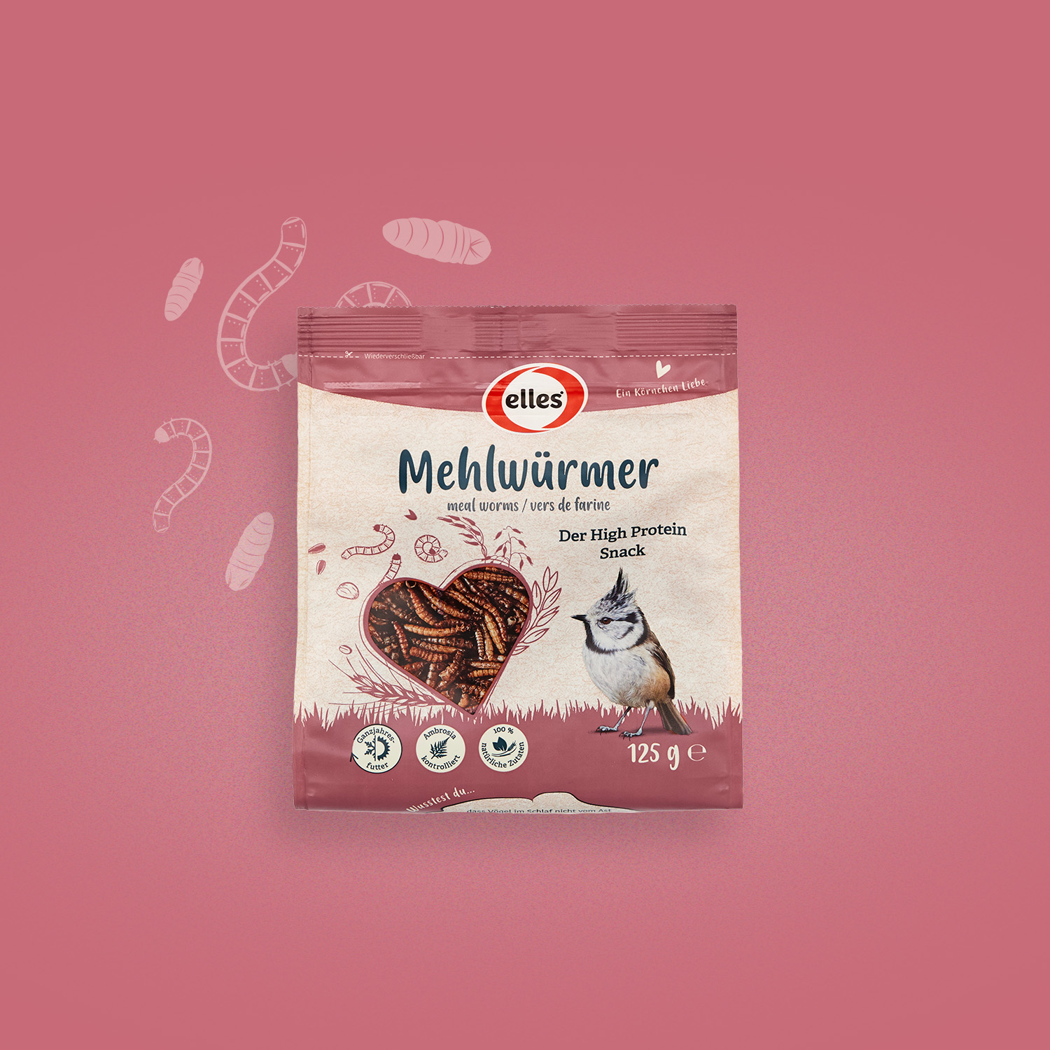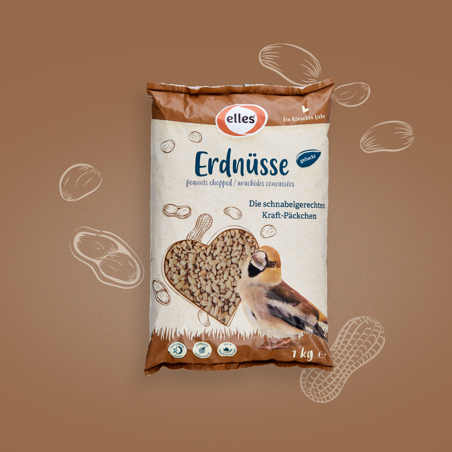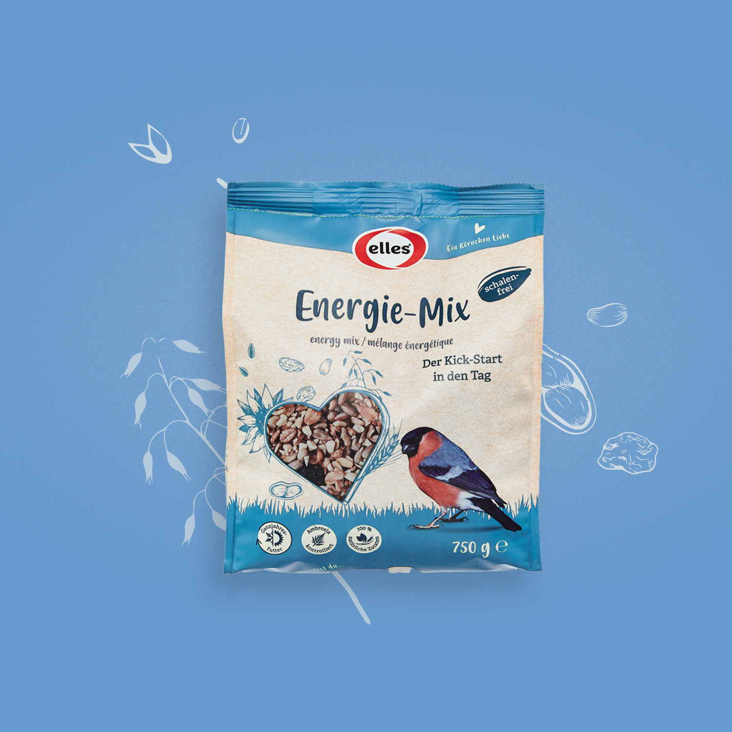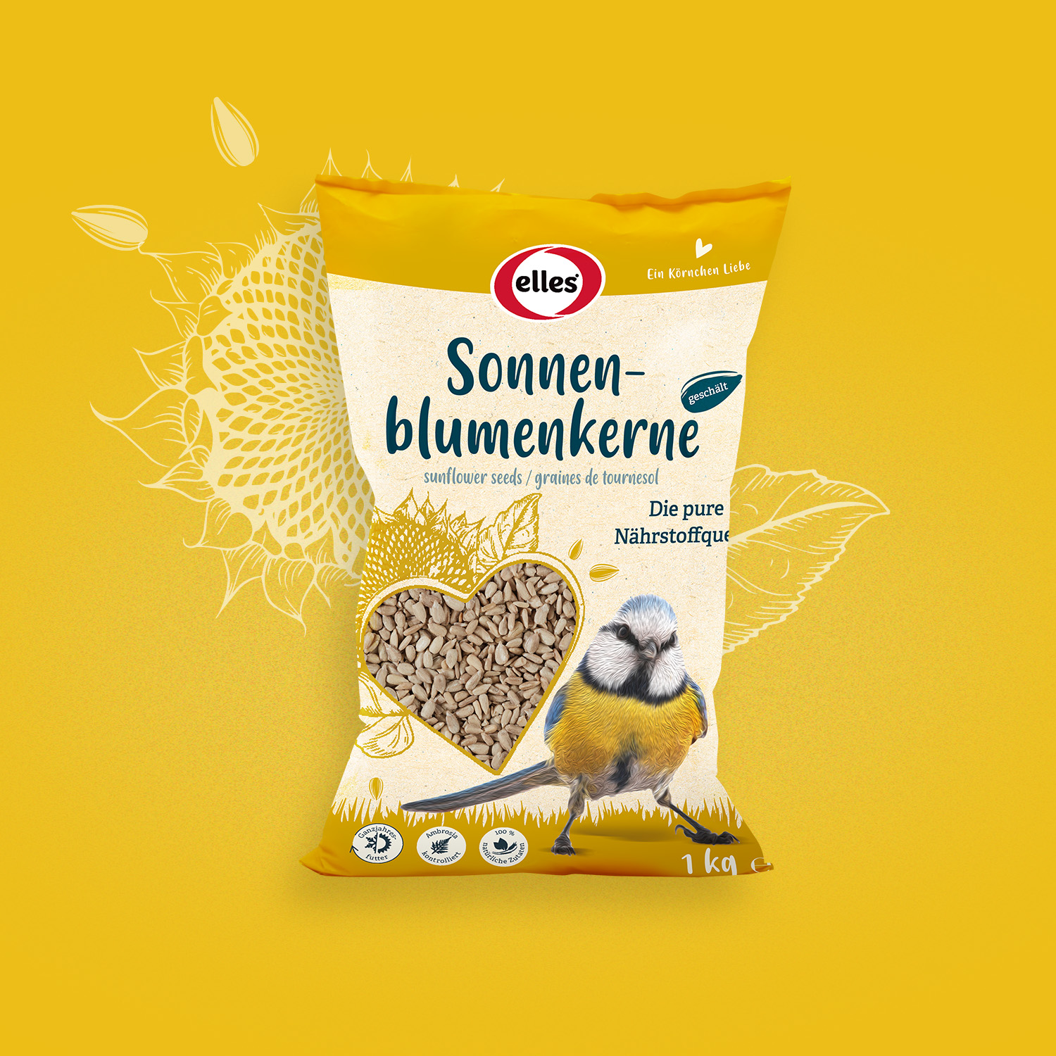 Für die Vogelfuttersortiment von elles sollten wir ein Packaging entwickeln, das sich stark vom Wettbewerb abheben sollte. Eine kernige Aufgabe!